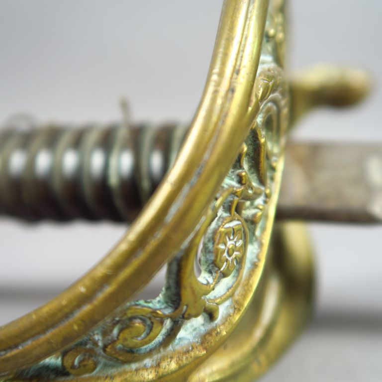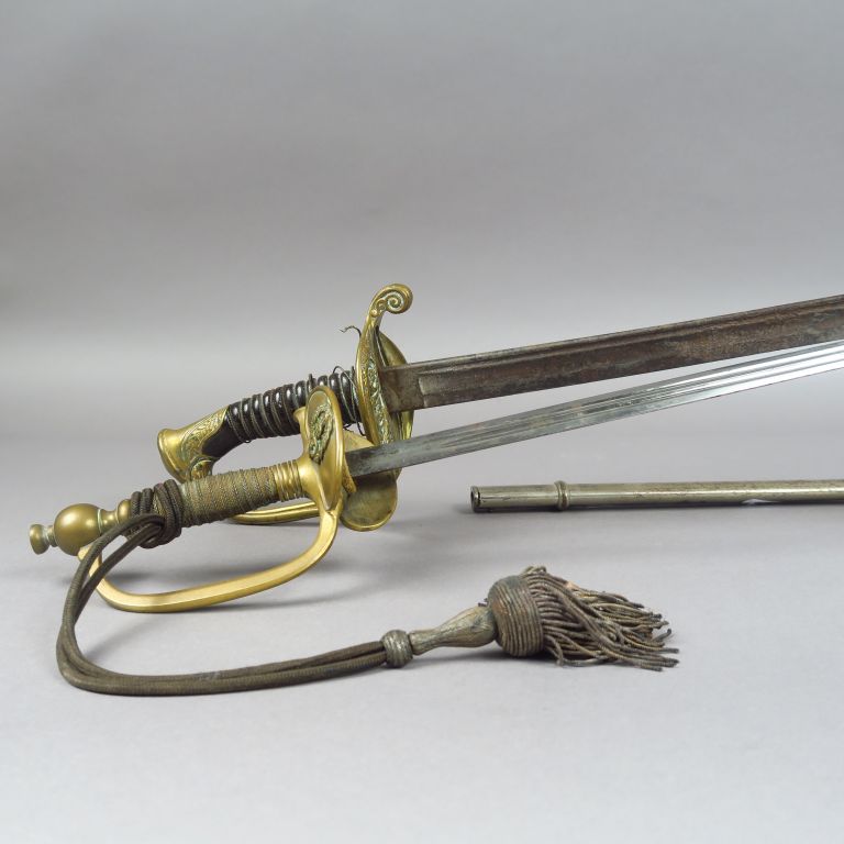 Lot composé de deux armes blanches françaises : une épée à clavier modèle 1817 de médecin dans son fourreau et un sabre 1845 d’adjudant de fantaisie sans fourreau. Etat 2.