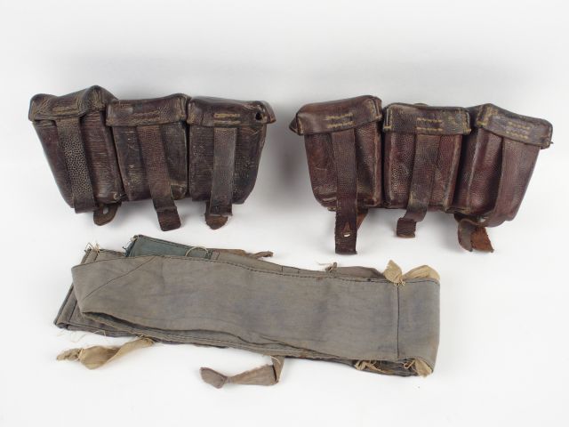 Lot composé de deux cartouchières Allemandes première guerre mondiale en cuir fauve, on y joint une cartouchière d’assaut en toile gris bleu (manque un compartiment). 2+.