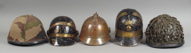 Lot composé de deux casques Français contemporains un avec sa salade de camouflage, l’autre avec son camouflage tissu, on y joint trois casques de pompiers 19eme incomplets bombe cuivre pour l’un, deux bombes fer peint en noir à garniture laiton.