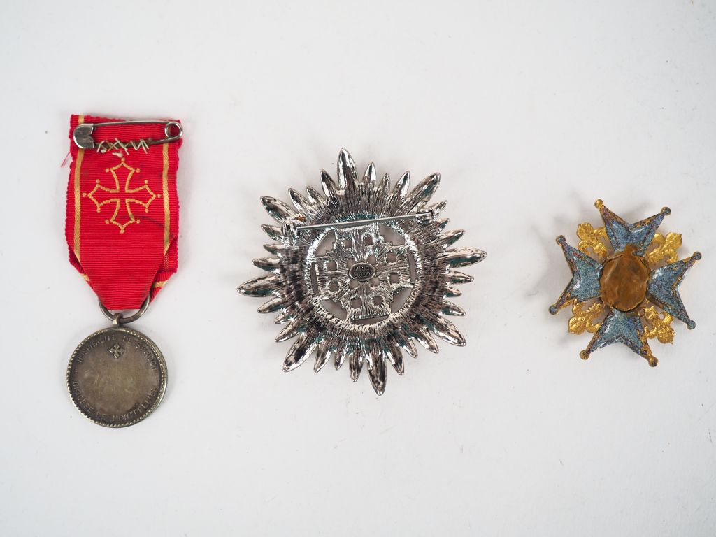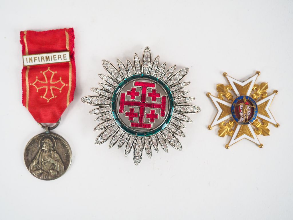 Lot composite comprenant un revers d’une décoration de Saint Louis en bronze doré, une médaille d’une infirmière avec croix occitane sur le ruban et une plaque pectorale moderne de commandeur de l’ ORDRE ROYAL du SAINT SÉPULCRE de JERUSALEM. (Etat 2)