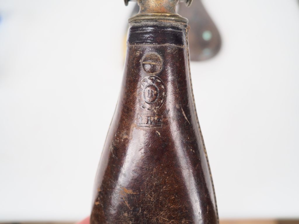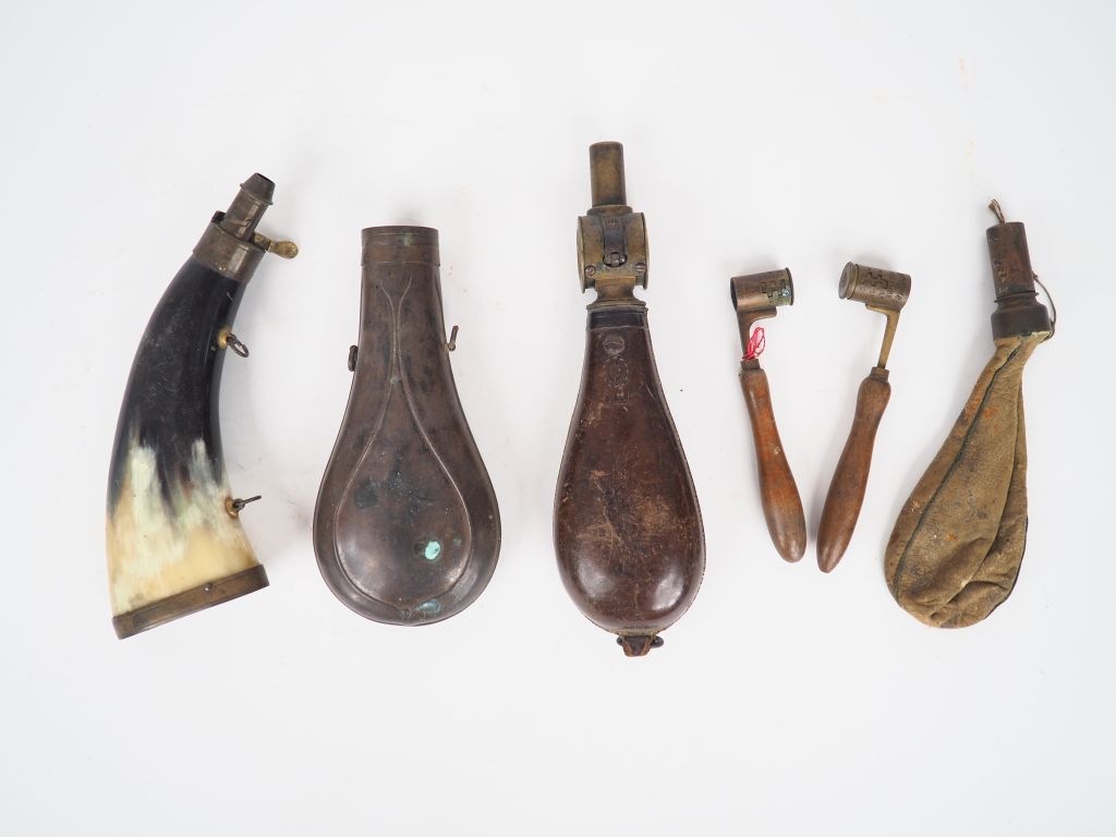 Lot comprenant 4 poires à poudre et à plomb diverses dont une belle poire à poudre par BOCHE à Paris, en laiton et en cuivre à système et à flanc vitré, on y joint 2 dosettes à poudre. Etat 2.