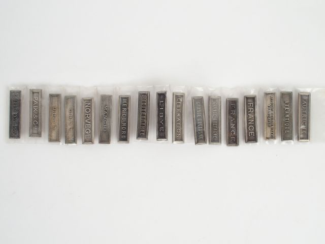 Lot de 17 barrettes argentées de médailles coloniales françaises, ensemble relatif à la seconde guerre mondiale. 1.