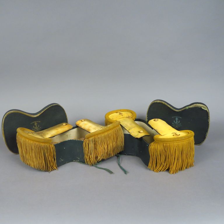 Lot de 2 paires d'épaulettes d'officier de marine en canetille doré, franges dorées également, dans leur boite en cartonnage vert Empire. Etat 1.