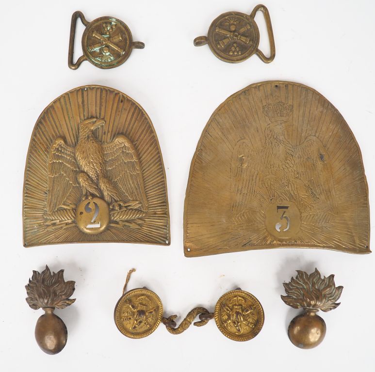 Lot de 2 plaques de bonnets à poils en laiton embouti sur fond rayonnant. Une des plaques porte embossé, un aigle impérial non couronné sur orbe découpé à jour du chiffre 2 et foudre de Jupiter. L’autre plaque non emboutie mais gravée au trait porte un aigle couronné sur orbe découpé à jour au chiffre 3 sur fond rayonnant (2 pattes déssoudées et absentes). On y joint 2 grenades de giberne en laiton embouti et 2 boucles double pour ceinturon en laiton dont une d’artillerie. Etat 2.