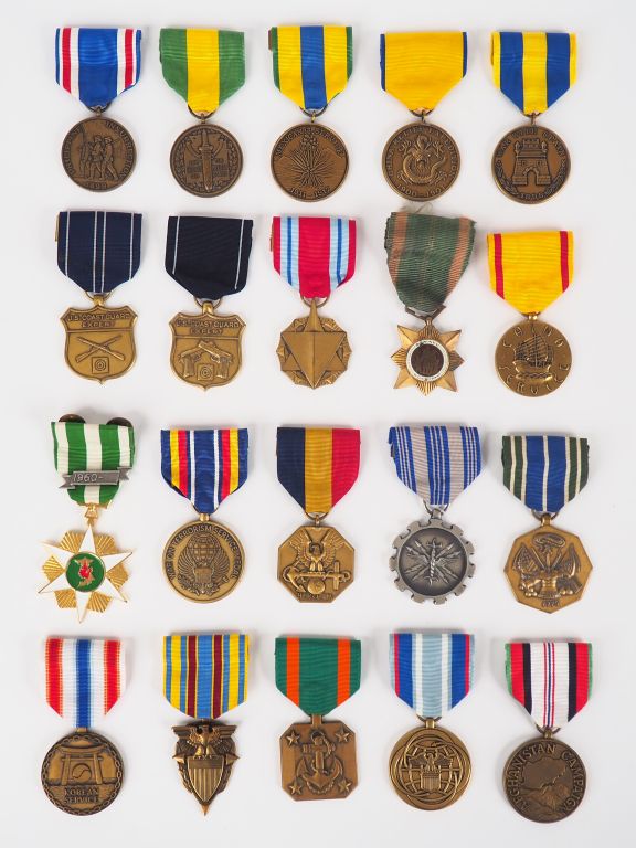 Lot de 20 décorations U.S. diverses post 1945 avec leurs rubans. Occasion idéale pour commencer une collection de phaléristique U.S. (voir photo). (Etat 1)