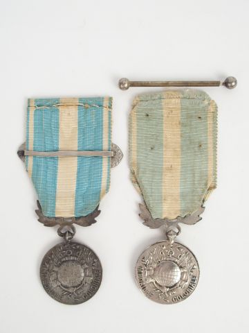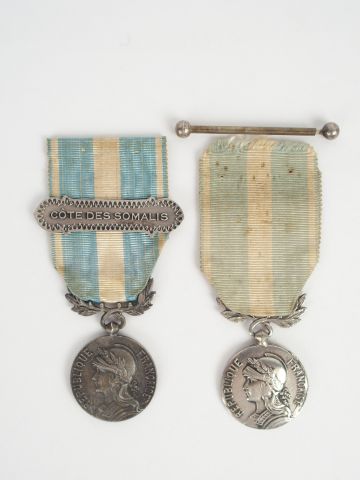 Lot de décorations françaises. Médailles coloniales, les 2 avec rubans, une avec rare barrette "COTE DES SOMALIS" 1.