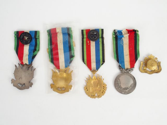 Lot de décorations françaises relative aux vétérans de la guerre de 1870/71 médaille de vétéran "OUBLIER JAMAIS" avec son ruban bleu blanc rouge bordure verte et noire, module argenté au trophée d'armes, une variante en bronze aux canons croisés et à la couronne de laurier, portant un bandeau émaillé bleu "vice président" et un casque Adrian entouré de lauriers, et une autre variante à module rond argenté, on y ajoute un insigne de boutonnière doré à bandeau émail bleu des anciens du 126eme R.I. On y joint pour finir une médaille de vétéran en bronze doré, bandeau émaillé bleu "oublier –Jamais", bouffette tricolore sur le ruban, barrette émaillé "Président" et barrette dorée "1870/1871". 1