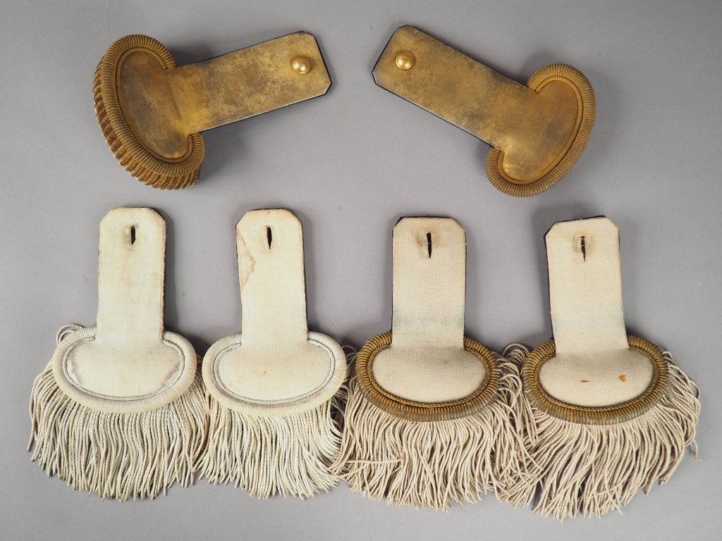 Lot de trois paires d’épaulettes. On y trouve une épaulette et une contre épaulette d’un officier subalterne d’infanterie du 64ème de ligne, corps doré, grosse tournante surlignée d’une petite tournante, franges à bouillons captifs graine d’épinard, canapé noir, attente laiton pour le fourreau cousu sur l’uniforme. On y joint une paire d’épaulette troupe en laine blanche corps à motif cul de dé, deux tournantes (une grosse et une fine en passementerie blanche) franges libres en laine blanche, canapés noir, deux boutonnières. On y joint aussi une paire d’épaulettes en laine blanche, deux tournantes (une grosse et une fine en canetille dorée) franges libres en laine blanche, canapés noir, deux boutonnières. Etat 1