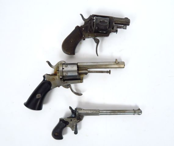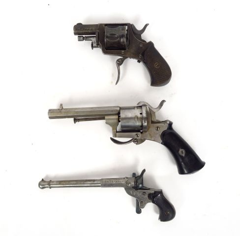 Lot de trois pistolets et révolvers anciens (belle base de collection pour amateur), on y trouve : Un revolver Royal Irish constabulary calibre 320 de fabrication Belge détente repliable. (Mécanisme d’indexation et de rotation du barillet à revoir). Un joli révolver système Lefaucheux calibre 7mm a broche numéro « 2280 », détente repliable, canon octogonal, monture en ébène lisse. Fonctionnement et polissage d’origine parfait. Un pistolet de cycliste calibre 6mm Flobert canon long octogonal au tiers puis rond, bouche tulipée. Crosse en bakélite quadrillée poinçon de réception Allemand au « U » couronné sur la culasse. 1. (1) Catégorie « D »2