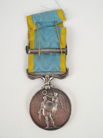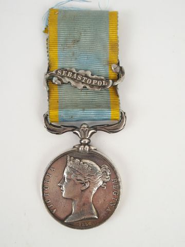 Médaille anglaise dite de Crimée attribuée à un français. Avers profil de la reine Victoria couronnée avec la légende "VICTORIA REGINA 1854". Sur le revers allégorie de la victoire couronnant un guerrier et le mot "CRIMEA".Ruban bleu à fines rayures jaunes, barrettes argent "SEBASTOPOL" tranche du module attribué " G. ROUZEAUD ART. DE LA GARDE"1