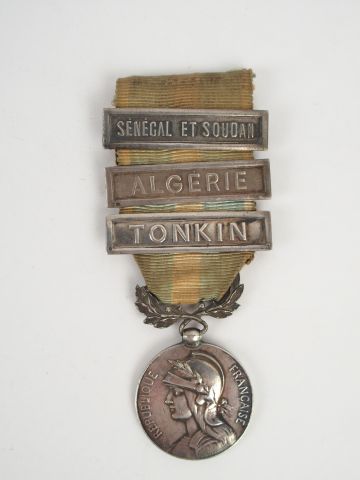 Médaille coloniale en argent, ruban bleu et blanc rayé, trois barrettes "SENEGAL et SOUDAN", "ALGERIE", "TONKIN" " 1