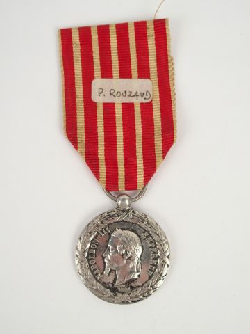 Médaille commémorative de l’expédition d'Italie (1859), attribuée aux 120 000 hommes du corps expéditionnaire, module argent signé « Barre » tête de l'empereur à l'avers, revers portant sur le pourtour "CAMPAGNE D'Italie 1859" et le nom des batailles "MONTEBELLO-PALESTRO-TURBIGO-MAGENTA-MARIGNAN-SOLFERINO", ruban rouge à fines rayures blanches 1.