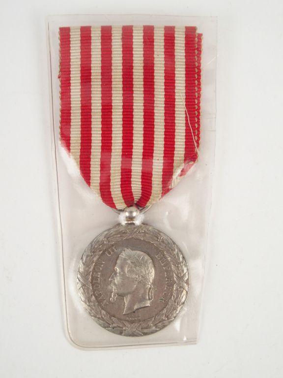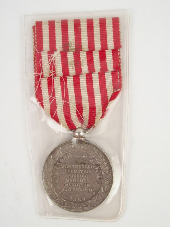 Médaille commémorative de l’expédition d'Italie (1859), attribuée aux 120 000 hommes du corps expéditionnaire, module argent signé « Barre » tête de l'empereur à l'avers, revers portant sur le pourtour "CAMPAGNE D'Italie 1859" et le nom des batailles "MONTEBELLO-PALESTRO-TURBIGO-MAGENTA-MARIGNAN-SOLFERINO", ruban rouge à fines rayures blanches.
