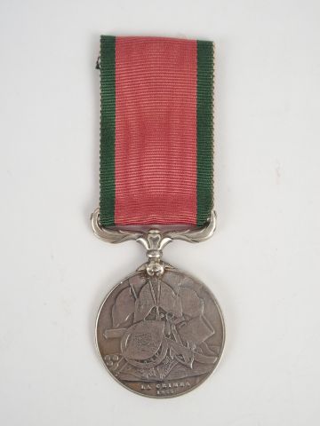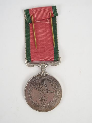 Médaille de Crimée turque pour un combattant Sarde (drapeau de Savoie à droite du drapeau Turc), module rond argent, Pontet floral pivotant. Avers canon, faisceau et 4 drapeaux, marquage en bas "La Criméa 1855", revers Tougrah du sultan et date 1271. Ruban rouge à fine rayures vertes à l'extérieur. 1.