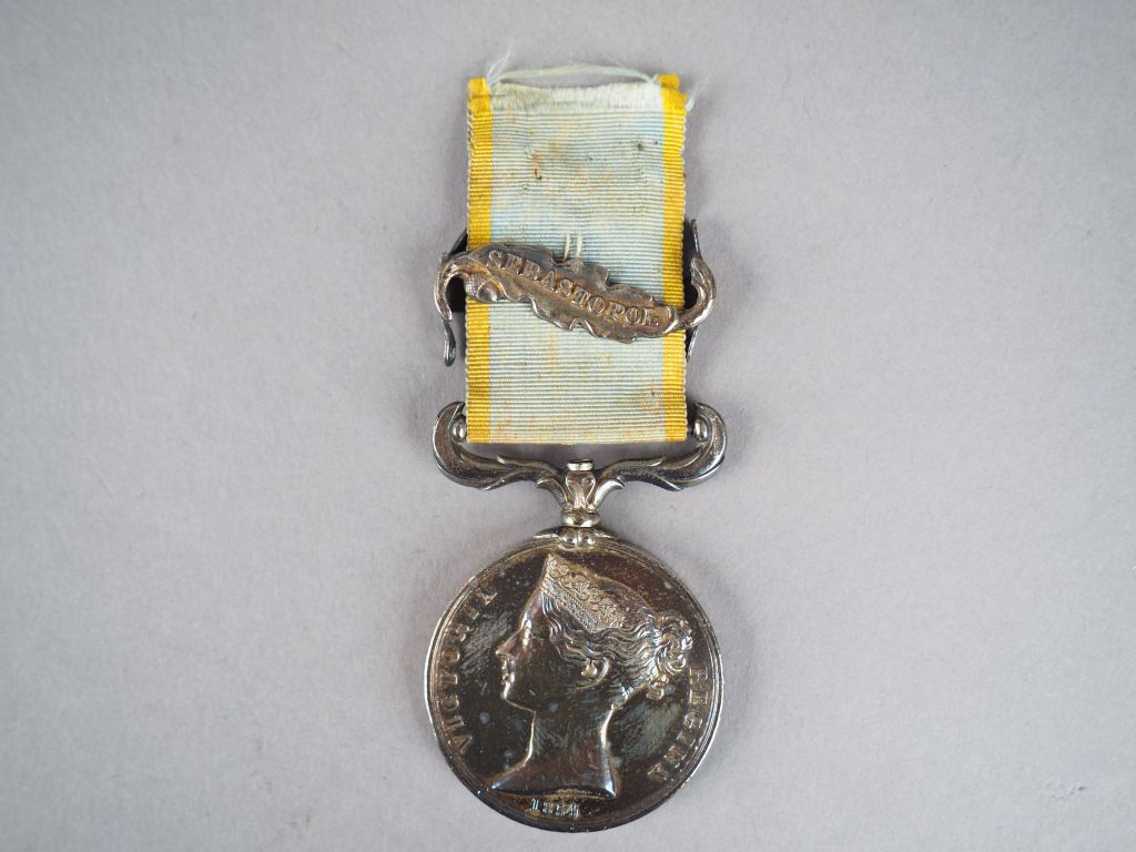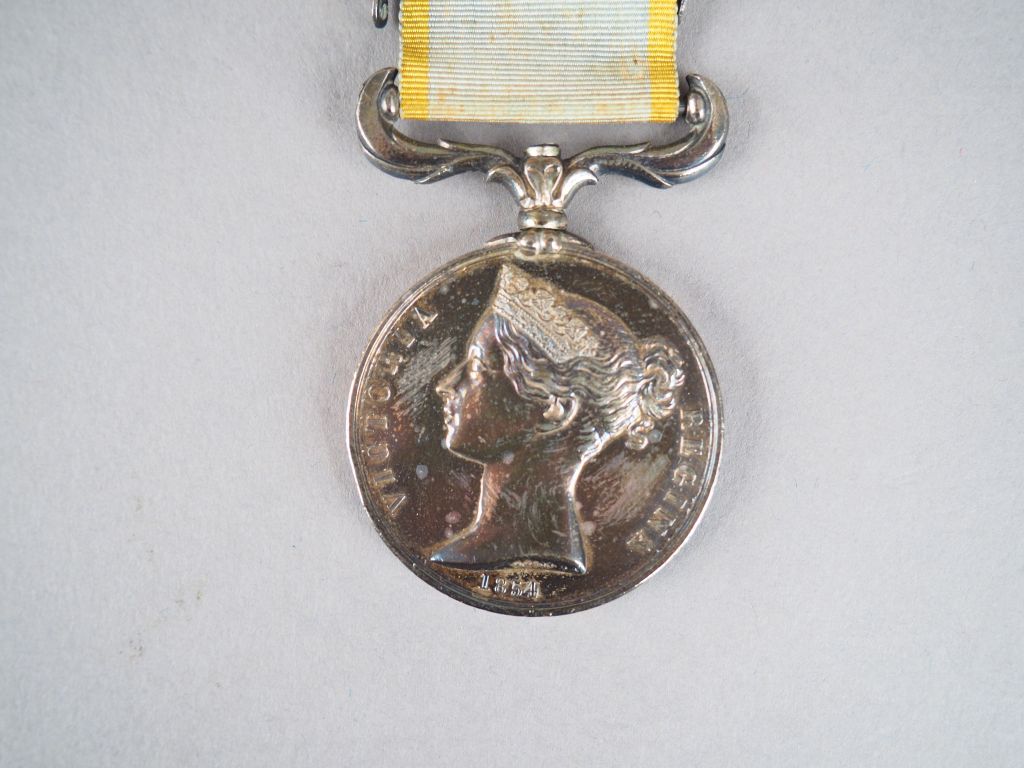 Médaille de Crimée « VICTORIA REGINA 1854 », ruban court et étroit bleu pâle à deux raies jaunes (insolé) avec sa barrette « SEBASTOPOL » (tranche vierge de marquage d’attribution à un combattant Français) Etat 1-
