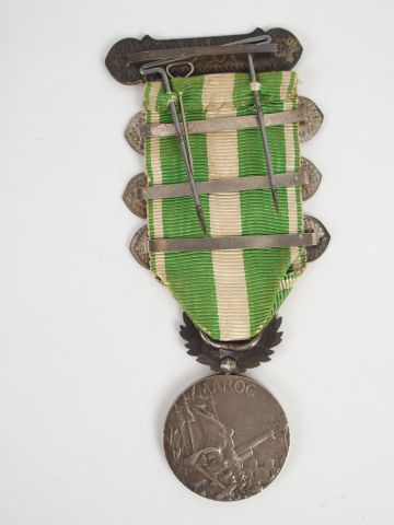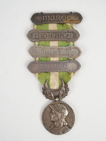 Médaille en argent commémorative de l'expédition au "MAROC", Ruban vert rayé de blanc, pontet articulé au feuillage et croissant, 4 barrettes "CASABLANCA", "HAUT GUIR","OUDJDA", "MAROC" 1