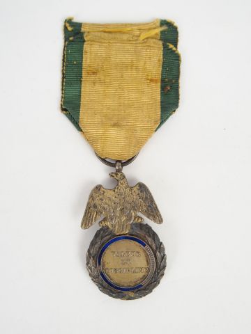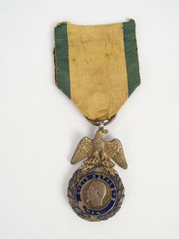 Médaille militaire second empire aigle doré aux ailes détachées, tête de l’empereur, avers devise « Louis-Napoléon » sur fond émail bleu (quelques manques), revers « valeur et discipline » module en argent avec son ruban jaune à deux raies vertes. 1