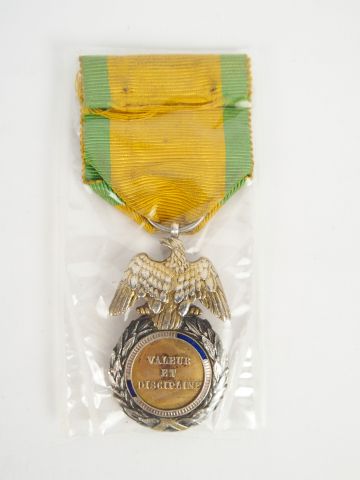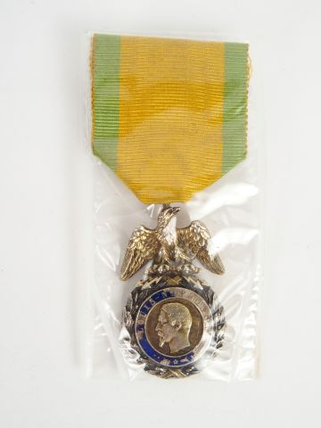 Médaille militaire second empire aigle doré aux ailes détachées, tête de l’empereur, avers devise « Louis-Napoléon » sur fond émail bleu (quelques manques), revers « valeur et discipline » module en argent avec son ruban jaune à deux raies vertes.1-.