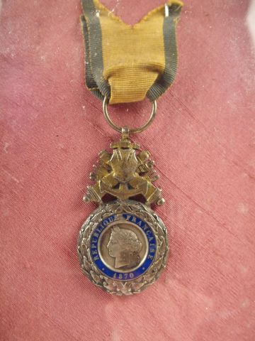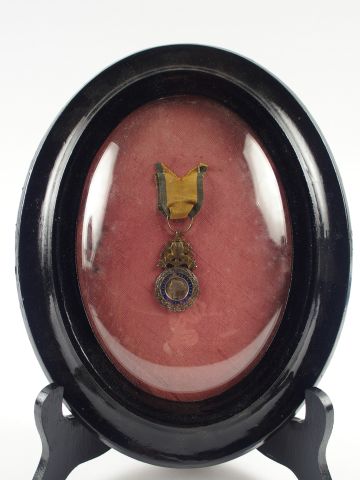 Médaille militaire troisième république probablement modèle dit « de Versailles » poinçon argent signée « Barre » au dos, trophée fixe biface, dans un cadre ovale en bois noir, verre bombé sur fond feu. Avec son ruban. Rare1-