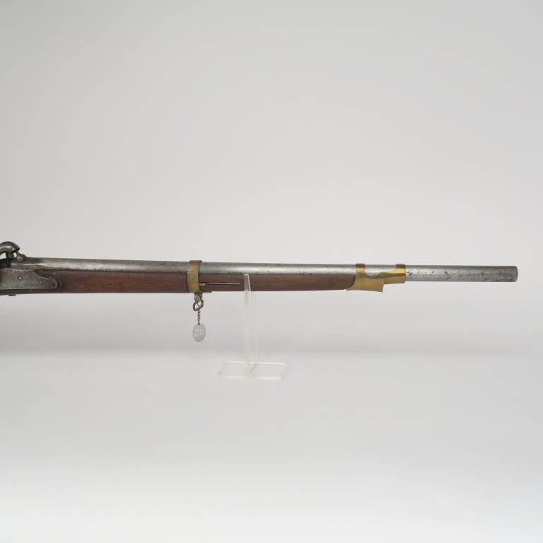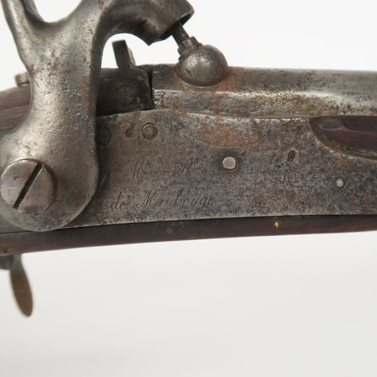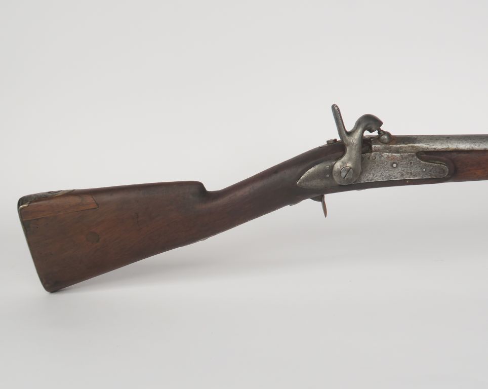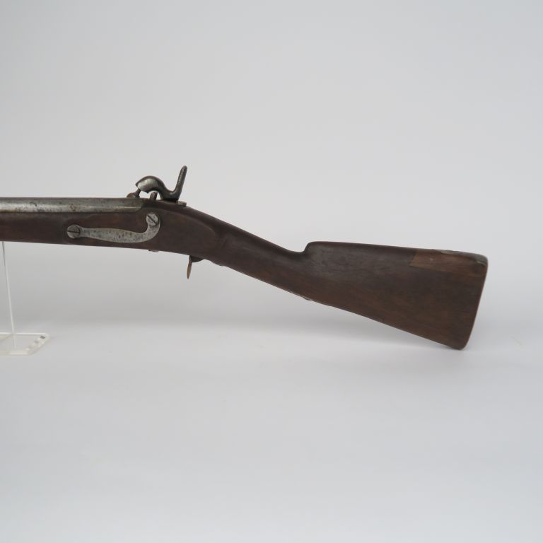 Mousqueton à percussion type gendarmerie 1825 T. Garnitures en laiton, contre platine en fer. Chien modifié. Crosse en noyer avec enture au retour de plaque de couche. E.M.