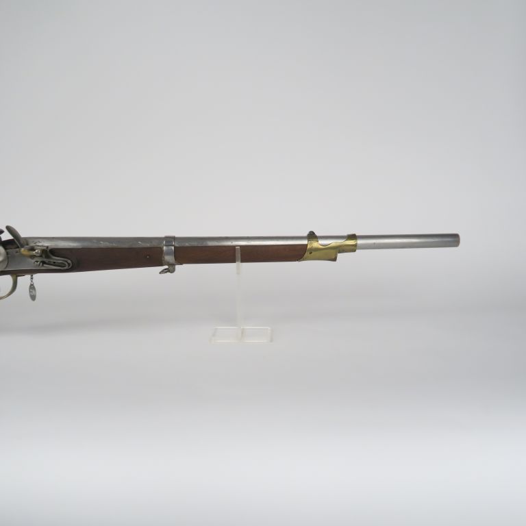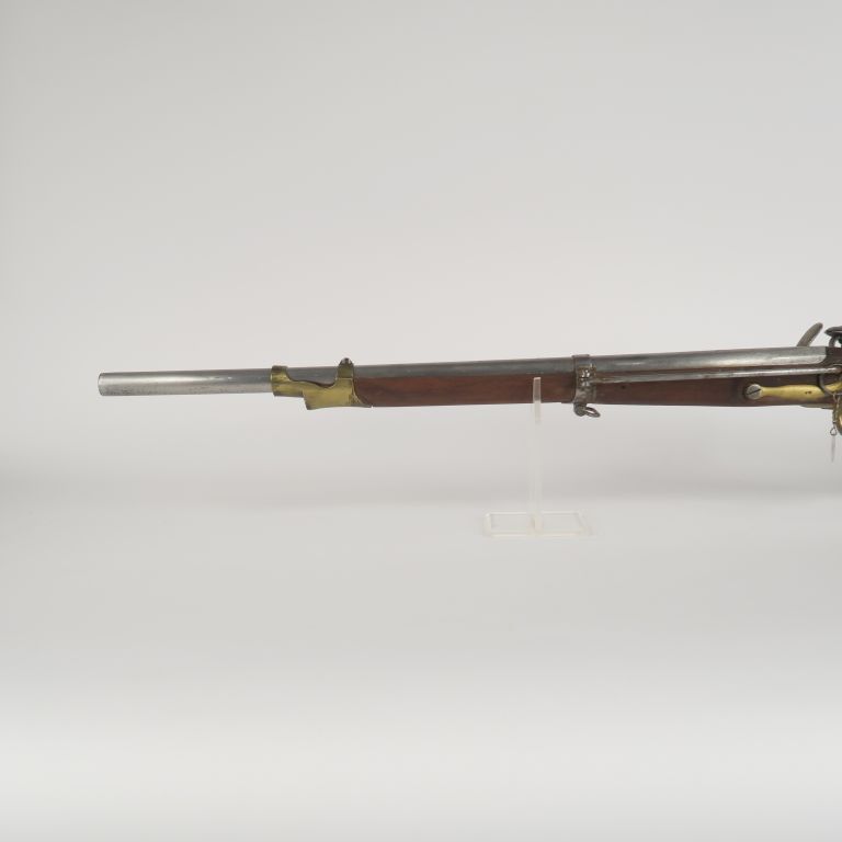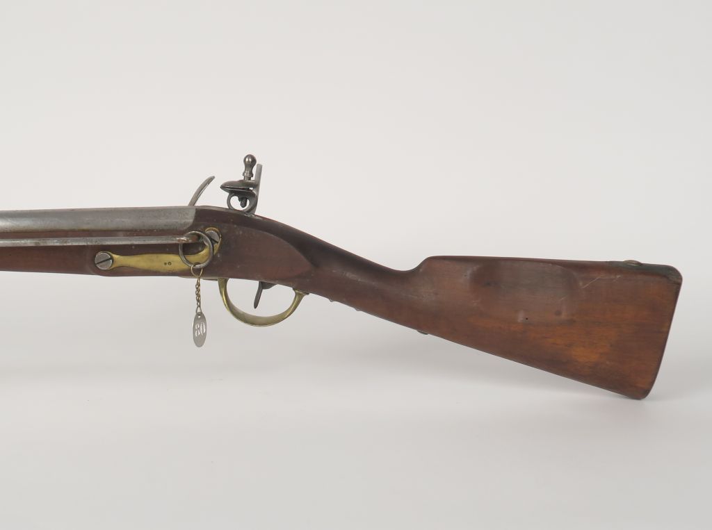 Mousqueton à silex, à tringle, type 1777-An IX. Canon rond, à pans au tonnerre. Platine vierge et chien à corps rond. Garnitures en laiton, certaines poinçonnées. Grenadière et tringle à anneau en fer. A.B.E. Non marqué.