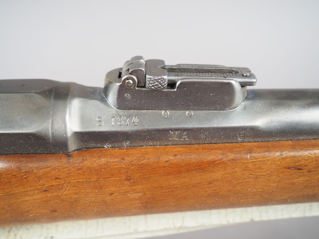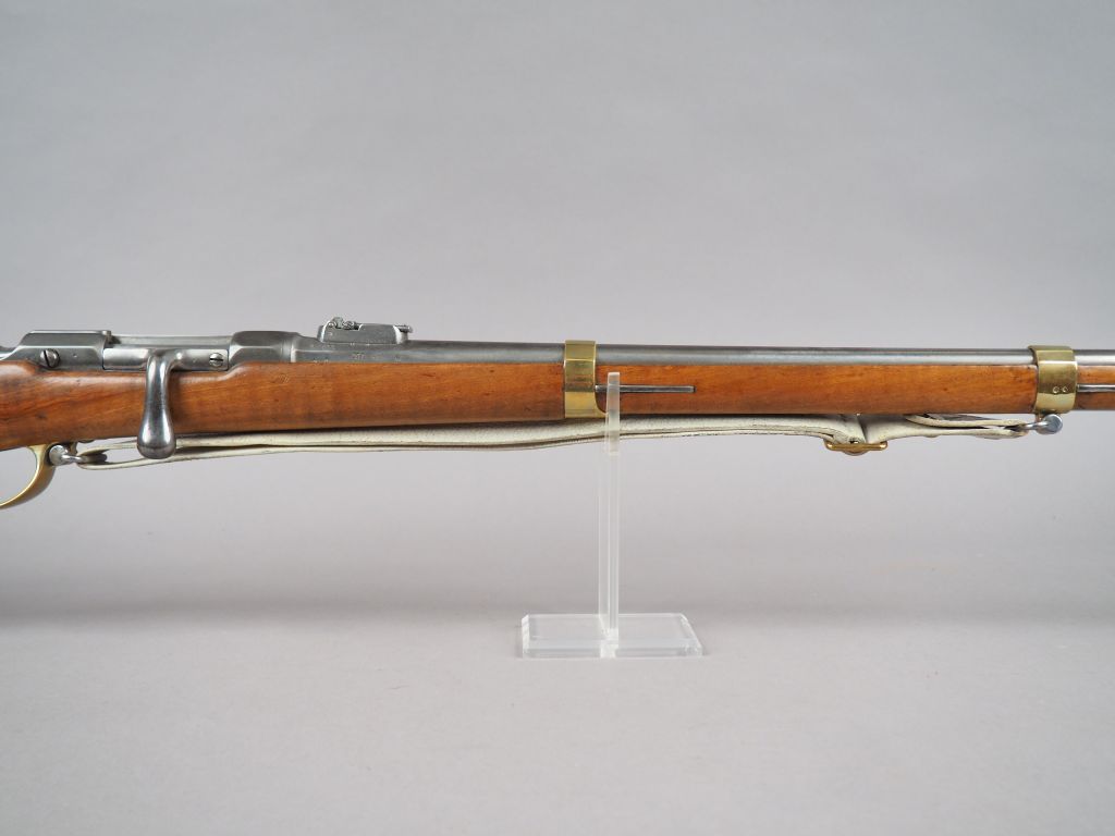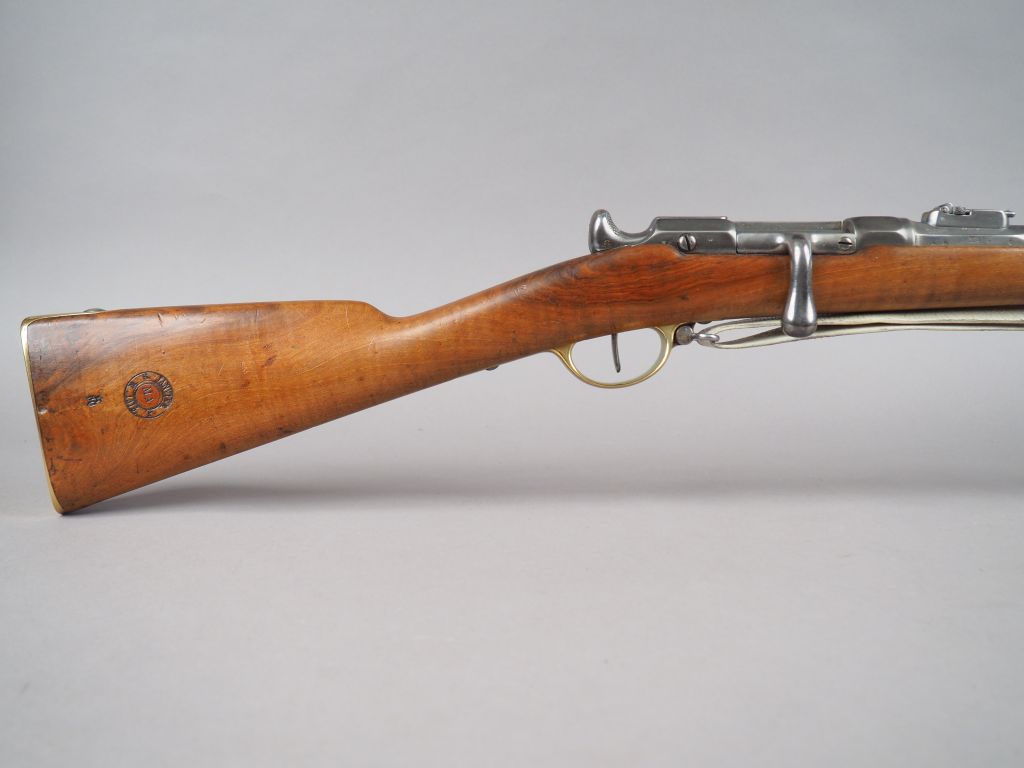 Mousqueton Chassepot cavalerie, fabrication « Manufacture d’armes de Saint Etienne ». Canon daté 1874. Bois réceptionnée 1875.Canon miroir, garnitures laiton, longueur totale 1160 mm canon de 680 mm de long, mécanisme fonctionnel, belle monture en noyer ondé. Arme nr G67790. Avec sa bretelle en buffleterie blanche. Arme de catégorie « D ». Etat 1