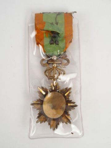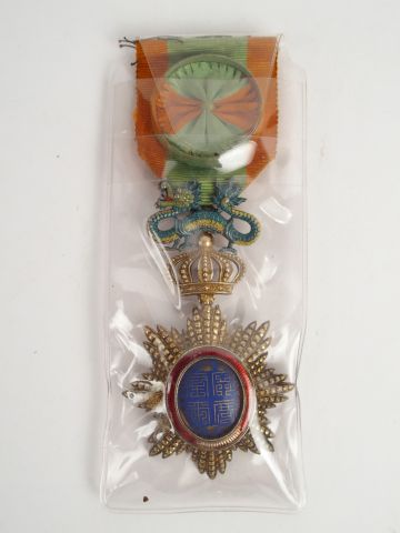 Ordre du dragon d’Annam, ruban à bouffette, insigne émaillé, quelques manques à la couronne rouge autour du centre. Très belle décoration. 1-.