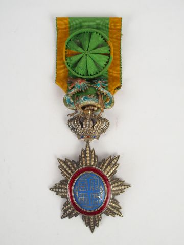 Ordre du dragon d’Annam, ruban à bouffette, insigne émaillé, quelques manques à la couronne rouge autour du centre. Très belle décoration. 1.