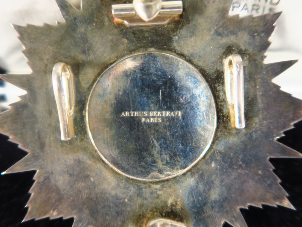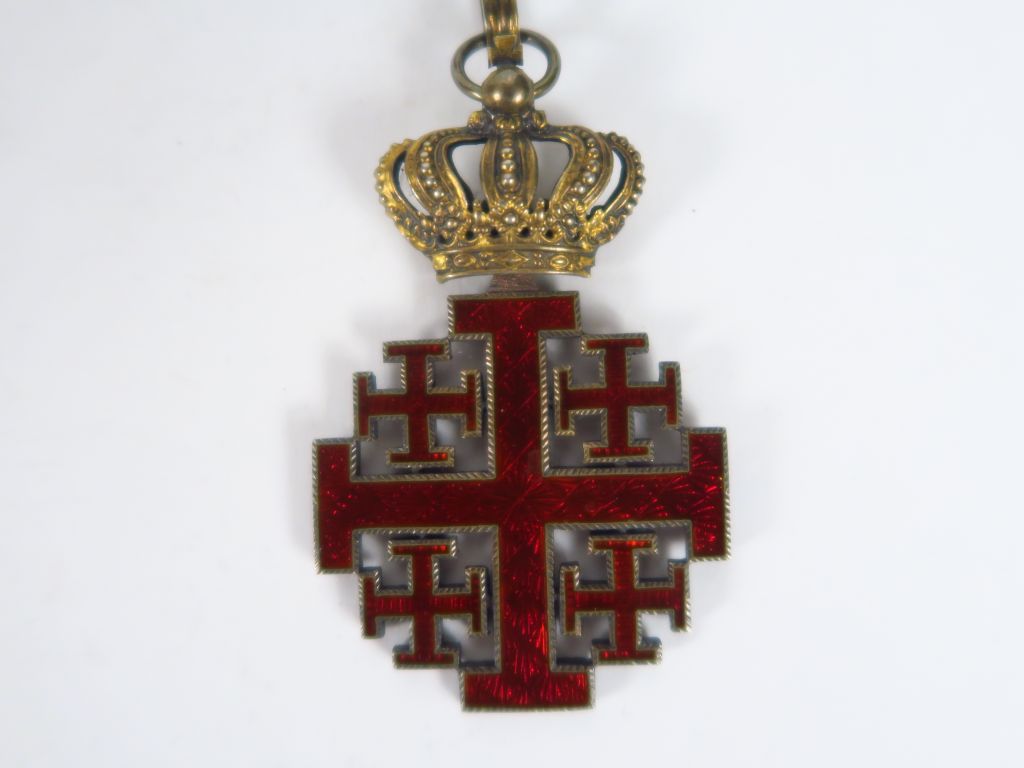 Ordre royal du St Sépulcre de Jérusalem. Grande croix (42 mm x 73 mm) potencée de gueule émaillée cantonnée de 4 croisettes également de gueule et potencées. Insigne en bronze doré et émail, couronne mobile sous anneau plat, grand ruban de tour de cou de moire noire. (1)