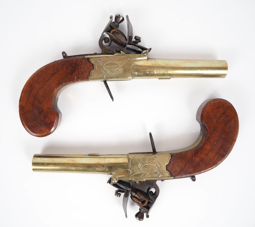 Paire de pistolets à coffre à silex, d’officier de marine britannique. Canons ronds et coffres signés « MAULIN LONDON », en bronze. Détentes rentrantes. Crosses en noyer. A.B.E. Vers 1800