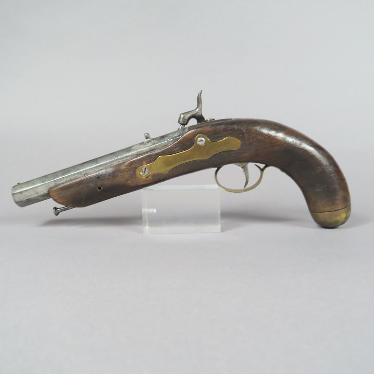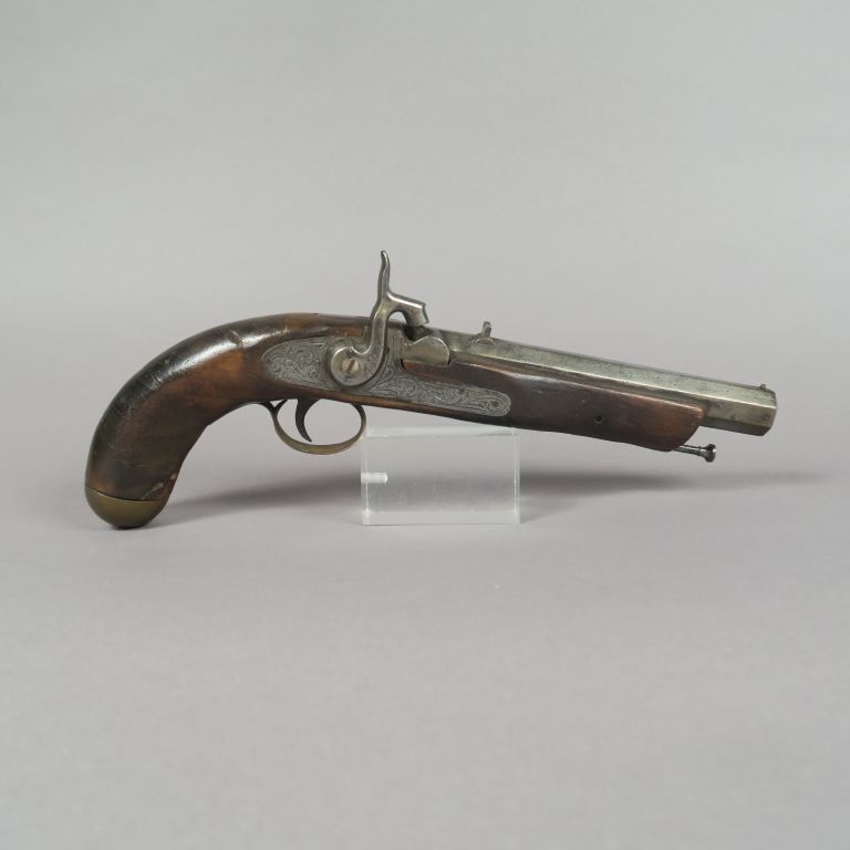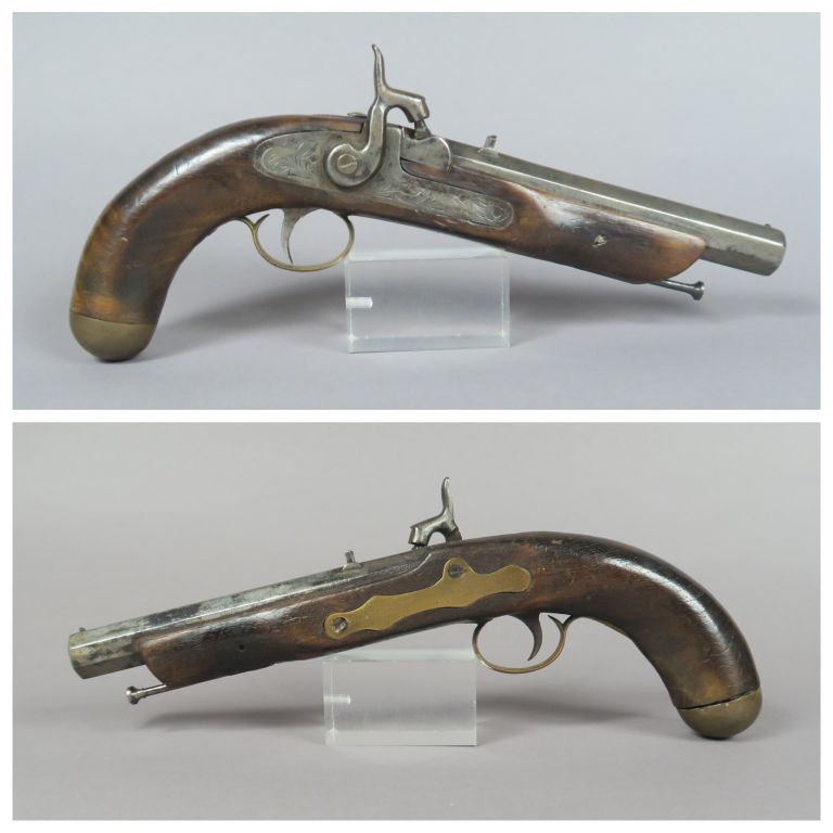 Paire de pistolets à percussion. Canon à pans. Platines et chiens à corps plat gravés de rinceaux. Garnitures en laiton. Fabrication décorative du XXe siècle.