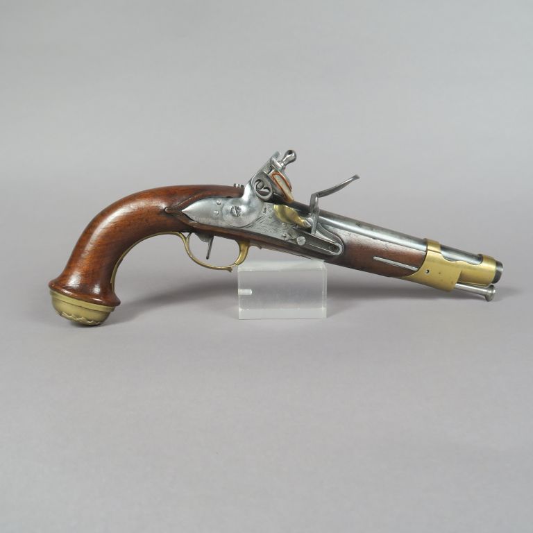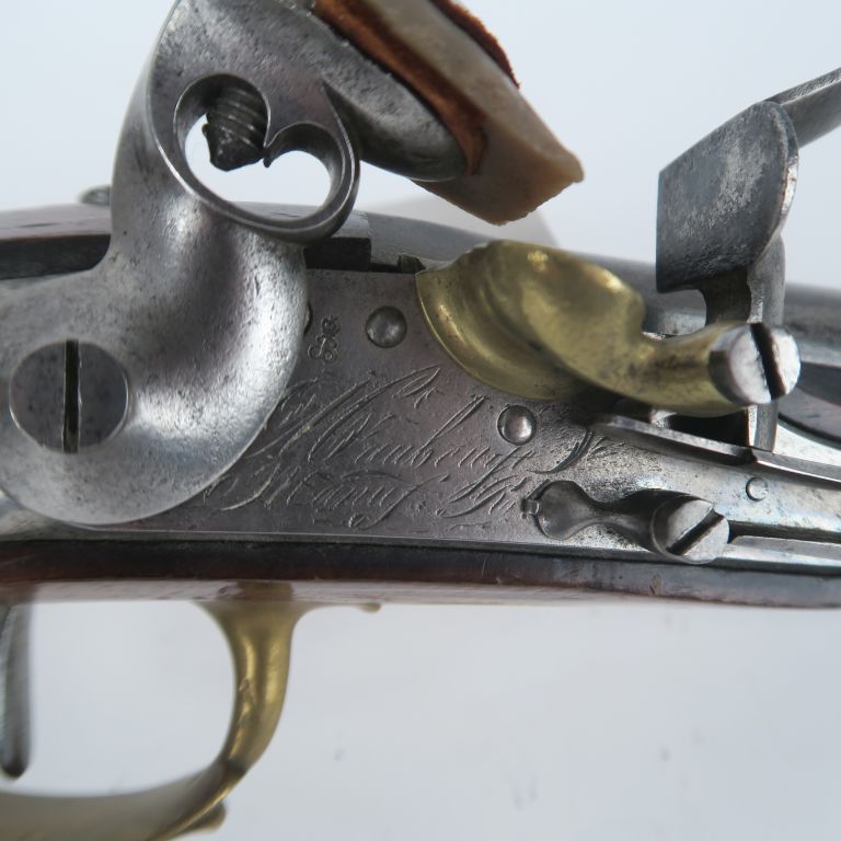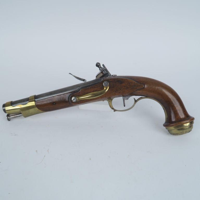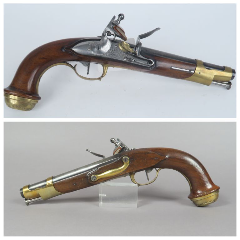 Paire de pistolets à silex de garde du corps du Roi, 1er modèle, modifiés. Canons ronds bronzés patinés, à meplats aux tonnerres, poinçonnés d’Alphand.Vis de queues de culasses changées. Platines gravées « Maubeuge Manuf Rle » poinçonnées de Bouyssavy. Chiens à corps ronds. Garnitures en laiton, devants de pontets en fleurs de lys. Calottes du 1er Type aux armes de France supprimées. Baguettes en fer. Canons : 21 cm. Totale : 38 cm. A.B.E. (Petits éclats, un pontet réparé). Epoque Restauration-Monarchie de Juillet.