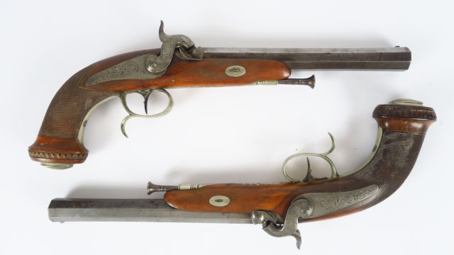 Paire de pistolets de tir ou de combat à percussion et platine à l’arrière. Toute garniture en maillechort, canons en damas octogonaux rayés, baguette fer, poinçon du banc d’épreuve de liège (ELG dans un ovale) frappé sur le flanc des tubes. Détente directe, monture en noyer blond quadrillé, pièce de pouces en argent (une absente), calotte à bourrelets proéminents gravés de feuillages, garniture de calotte en maillechort formant réserve d’amorce et couvercle à décor de coquille saint Jacques. Les deux pistolets sont homogènes, en très bon état, et ils n’ont subi aucun outrage de manutention ou de corrosion. Etat neuf. Expert : Gilles Sigro - gilles.sigro@armurerietoulouse.com