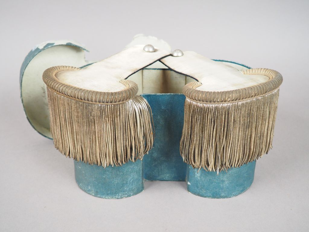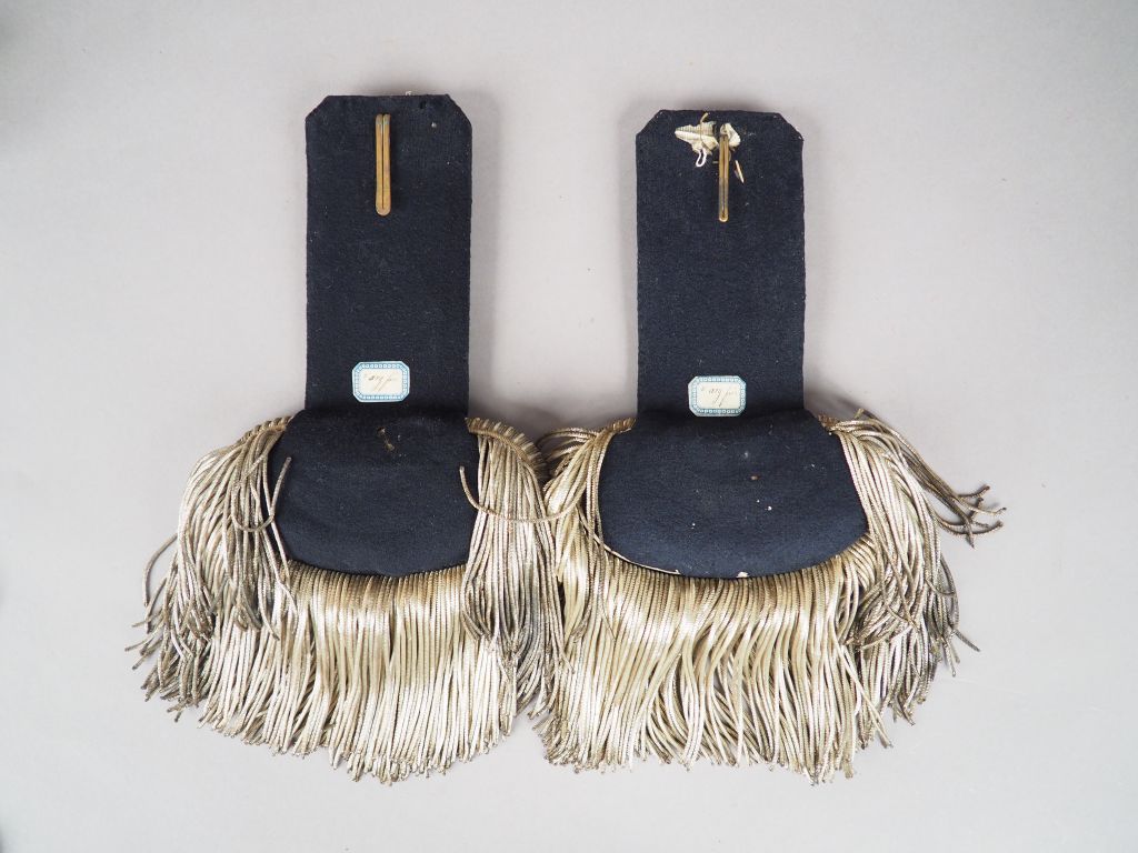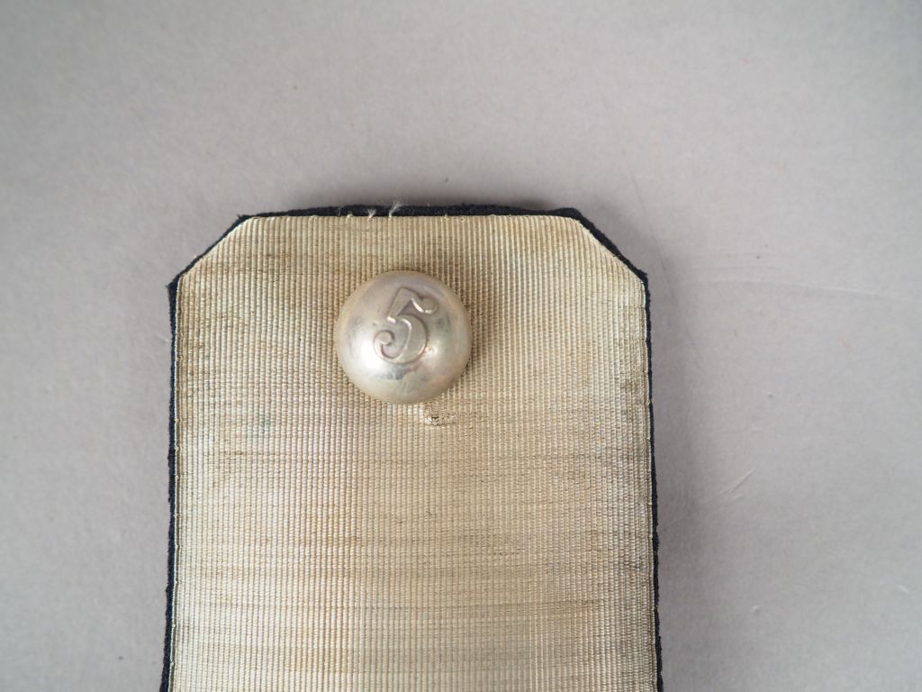 Paire d’épaulettes de capitaine Second Empire, bouton hémisphérique argent au chiffre « 5 » (5ème régiment de cuirassier ?). Epaulettes argent, grosse tournante doublée d’une tournante fine, franges libres en canetille d’argent, dans leur boite en cartonnage vert (couvercle abimé).