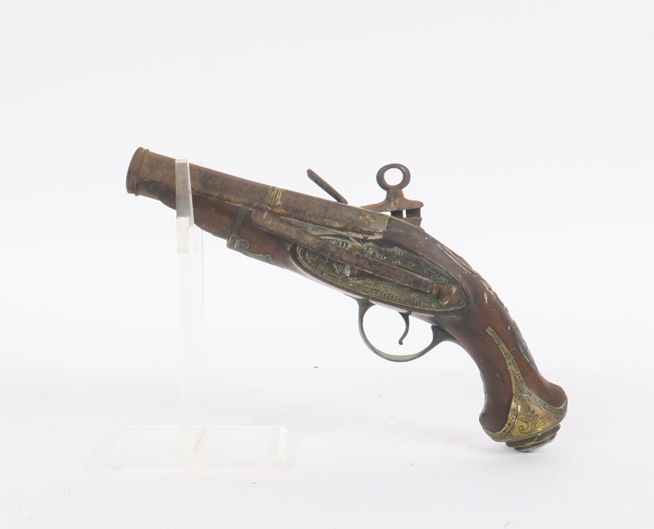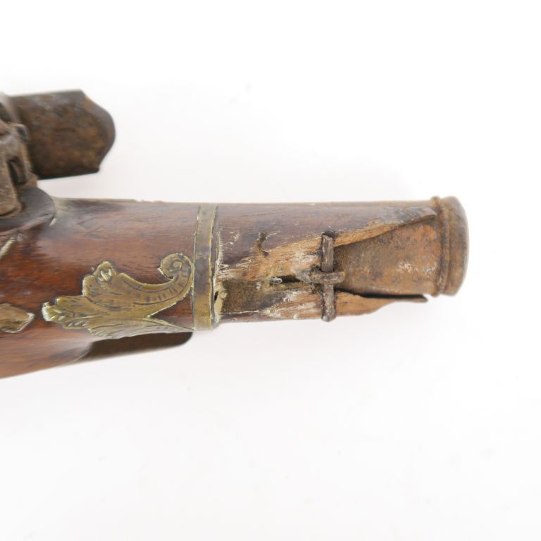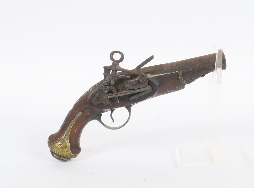Petit pistolet à silex « Ripoll ». Canon rond à pans au tonnerre, avec poinçon de canonnier à fond d’argent. Platine à la Miquelet. Garnitures en laiton gravé. Crochet de ceinture en fer. Pièce de pouce et clou de calotte à décor de profil de guerrier, en argent. E.M. (Oxydations, manque l’avant du fut et du pontet. Vers 1780-1800 Longueur : 24 cm.