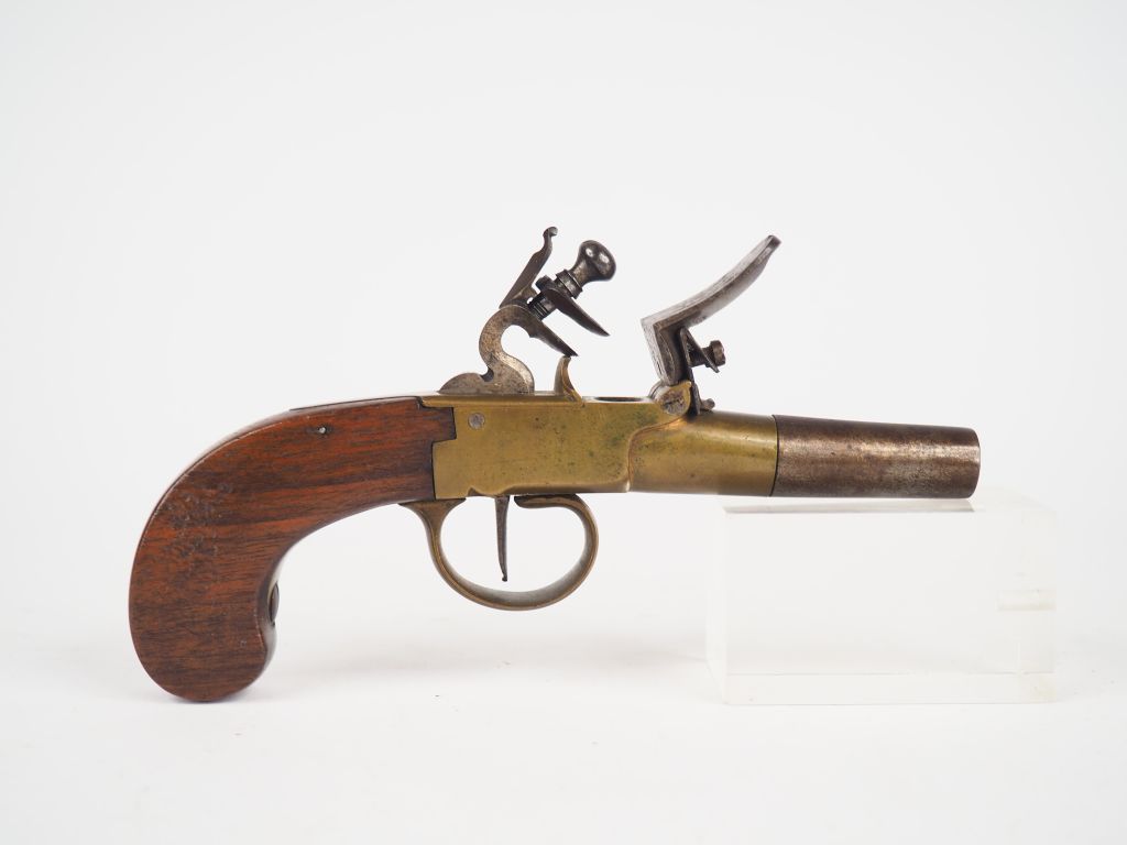 Petit pistolet de gousset à coffre et à silex, arme montée bronze, canon acier rond de 45 mm de long en calibre 44 à la livre lisse, pontet rond en bronze, chien à espalet plat, crosse noyer lisse à flancs plats, longueur totale 180 mm de long, mécanisme fonctionnel. (Etat 1). Arme de catégorie "D"