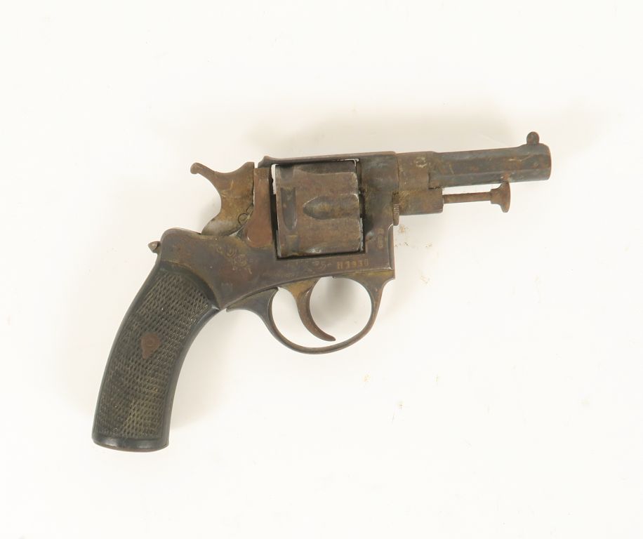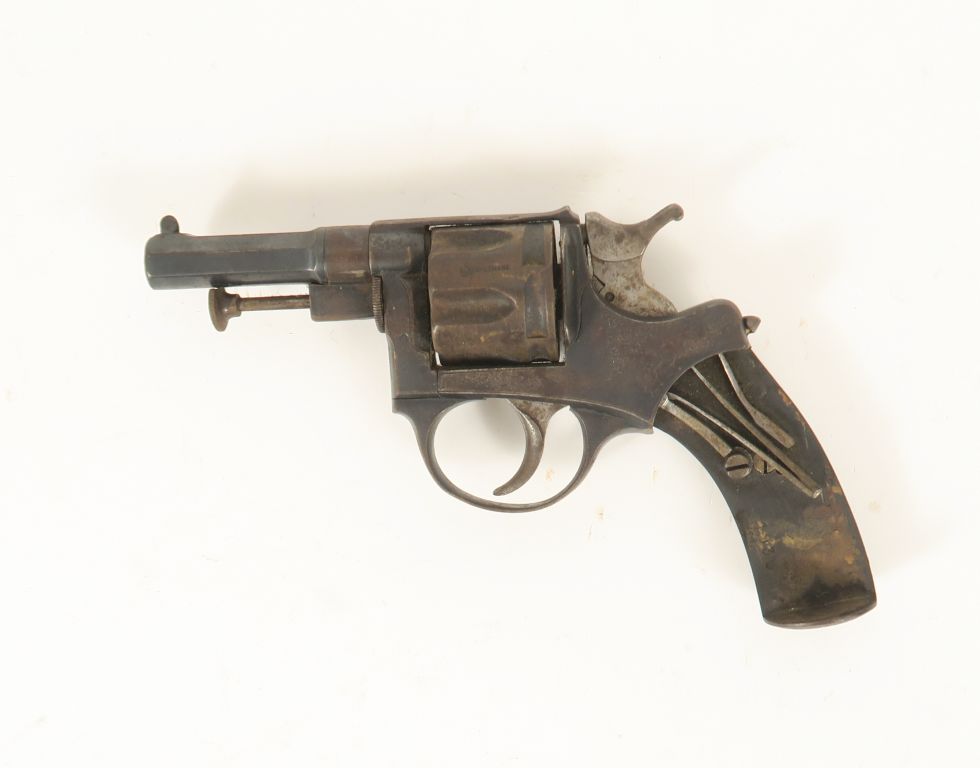 Petit revolver type Chamelot Delvigne, six coups, calibre 320, double action. Canon à pans. Carcasse gravée. Barillet poinçonné St Etienne. Manque une plaquette, mécanique à revoir.