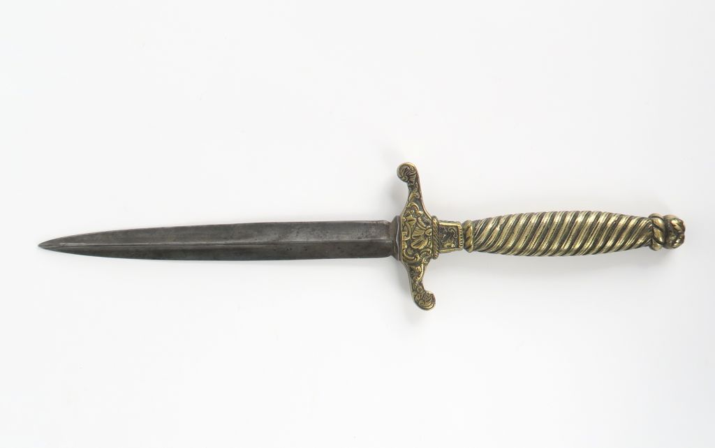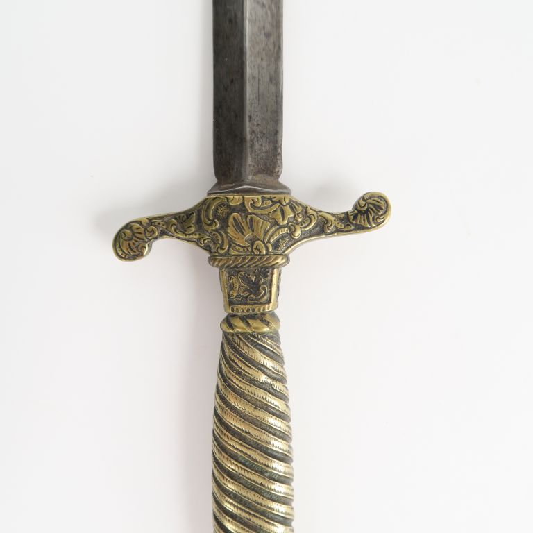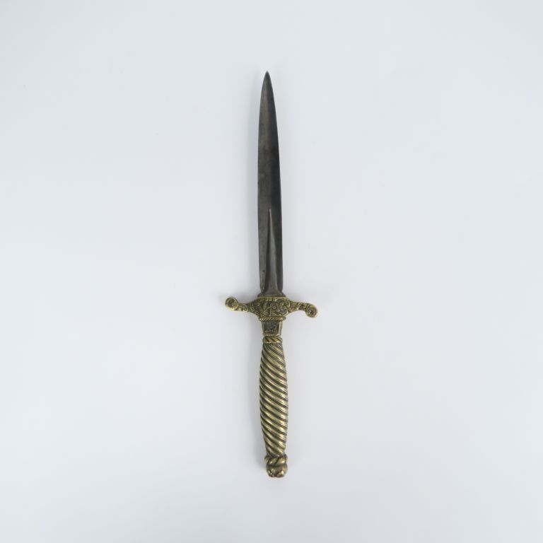 Petite dague à poignée en laiton, à décor spiralé et feuillagé. Lame à arête médiane. Fin du XIXe siècle. SF.