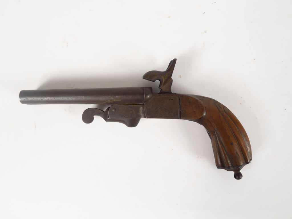 Pistolet à percussion double juxtaposé à coffre et canons basculants en calibre 12 mm à broche. Détentes escamotables, ouverture par clef sous la bascule, monture en noyer type renaissance, calotte diamant acier, manque l'anneau, mécanisme fonctionnel, arme de catégorie D.(2)