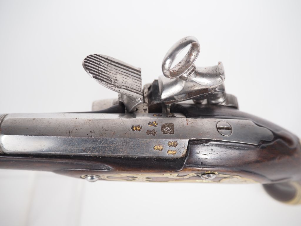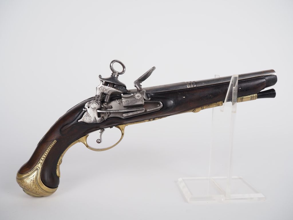 Pistolet à silex d’officier espagnol. Canon rond, à pans au tonnerre, avec poinçons (restes d’or) et poinçon de canonnier « GC ». Platine à la Miquelet, gravée. Garnitures et pièce de pouce en laiton découpé et gravé. Crosse en noyer (cassure réparée à la crosse). Baguette postérieure. A.B.E. (Nettoyé) Vers 1780