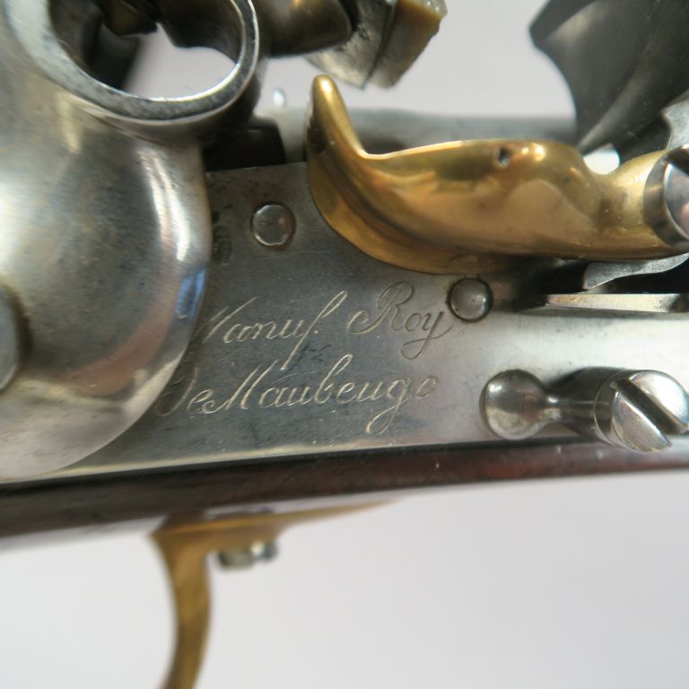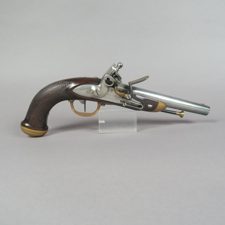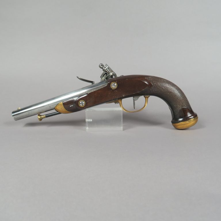 Pistolet à silex d’officier modèle 1816. Canon rond, à pans au tonnerre, poinçonné. Queue de culasse avec cran de mire. Platine à corps rond gravé « Manuf Roy de Maubeuge » et chien à corps ronds. Garnitures en laiton cuivré. Crosse en noyer quadrillé. Longueur totale : 35 cm. A.B.E. (Reconditionné, marquages réappuyés)