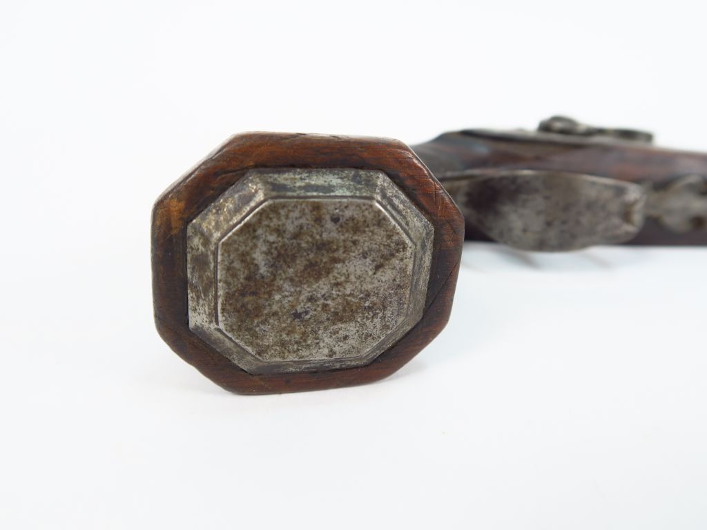 Pistolet à silex époque 1er Empire modifié à percussion, monture noyer (accident) très arquée, se prolongeant à mis canon, quadrille écossaise, calotte octogonale à pans, arme montée fer, pontet demi charollais, mécanisme fonctionnel canon octogonal au demi puis rond. Baguette cassée dans son canal. Arme de catégorie « D » (2-)