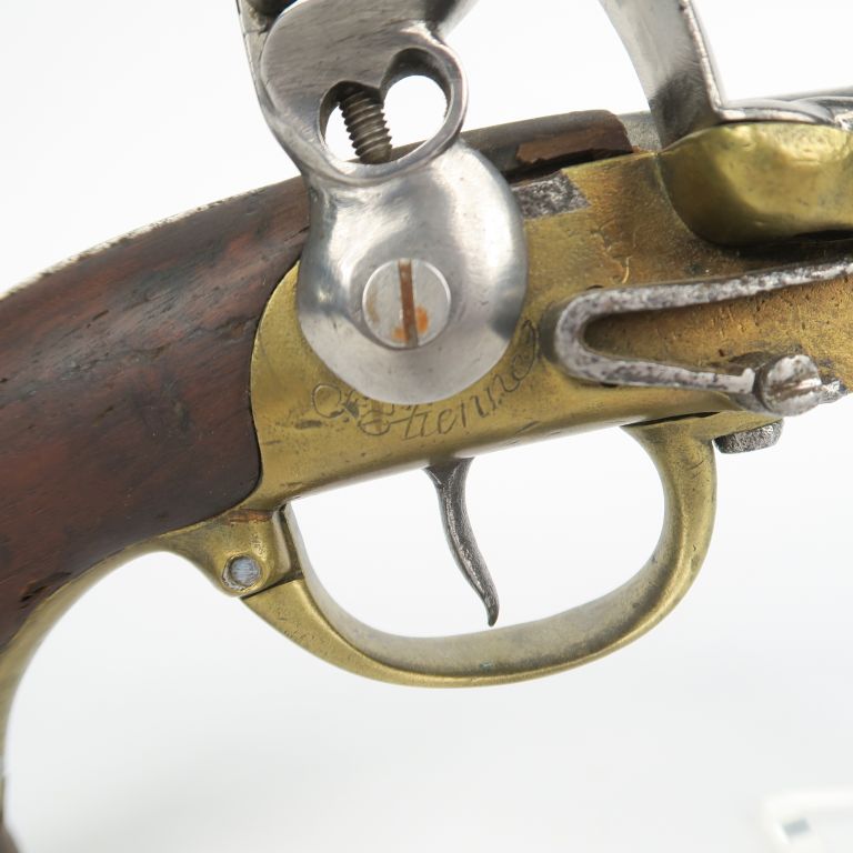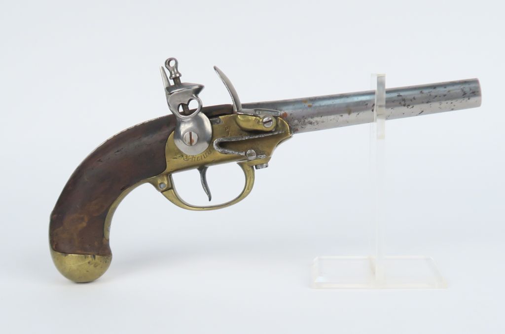 Pistolet à silex modèle 1777 du 2e type. Dans l’état. Fortes piqûres, chien changé, restaurations au bois.
