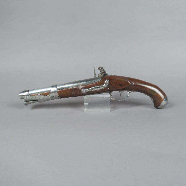 Pistolet d’arçon à silex modèle 1763-66, de fabrication révolutionnaire. Canon rond à méplats au tonnerre. Queue de culasse gravée M1763. Platine poinçonnée et gravée « Mre de Libreville » et chien à corps plat. Garnitures en fer. Baguette en fer. Crosse en noyer reverni. Longueur canon : 23 cm. Longueur totale : 40 cm. E.M. (Fortes piqures nettoyées)