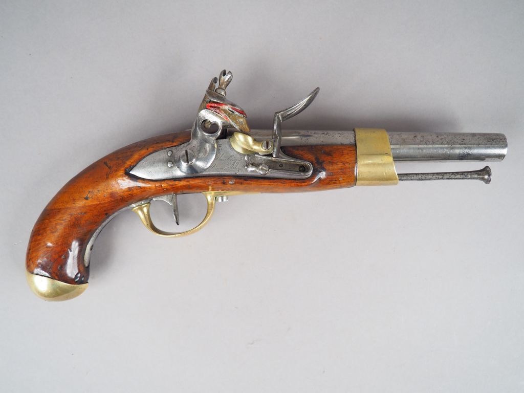 Pistolet de Cavalerie modèle An XIII, fabrication « Maubeuge Manfu re imple » en 1808 (date sur le pan gauche du tube), queue de culasse marquée profondément « Mle An 13 ». Mécanisme fonctionnel. Etat 1-
