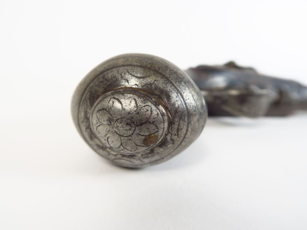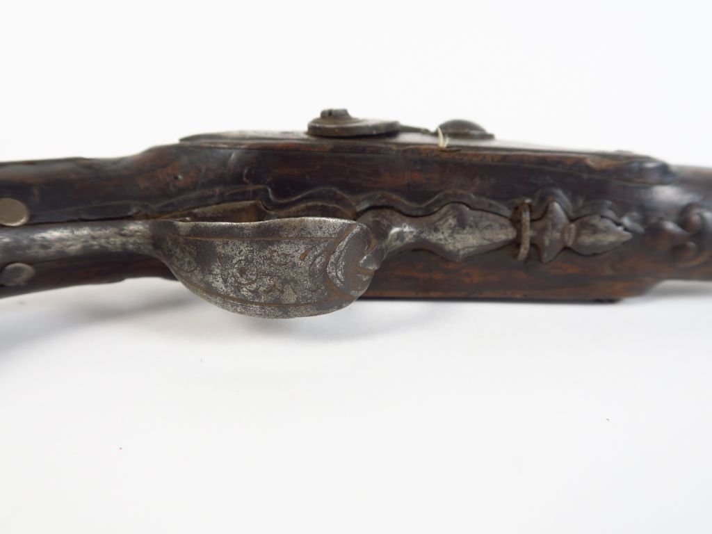 Pistolet de demi-arçon primitivement à silex et transformé à percussion par pose d’une masselotte. Arme montée fer, calotte à longues oreilles, baguette fer, mécanisme fonctionnel, monture noyer avec quelques manques mineurs. Arme de catégorie « D » (3+)