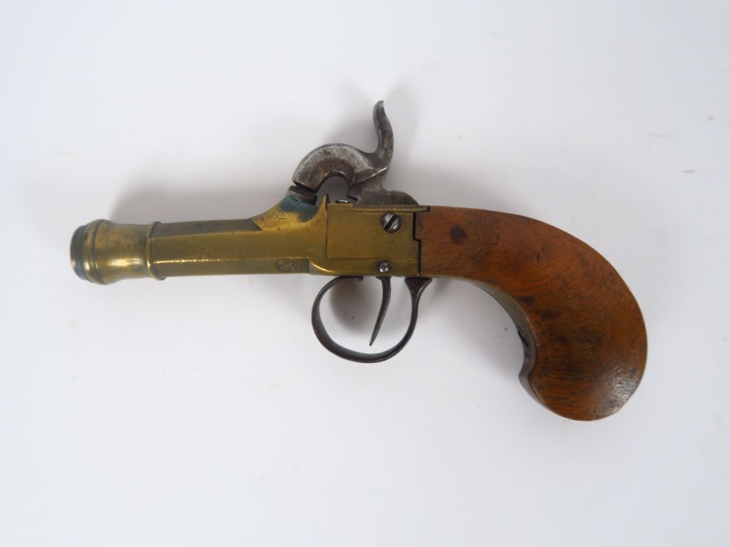 Pistolet de poche à coffre et à percussion, en bronze coulé, canon octogonal renforcé à la bouche. Chien, détente, pontet fer, crosse lisse plate en noyer blond, réception Liégeoise (E.L.G.), mécanisme fonctionnel (1-).Arme de catégorie D.