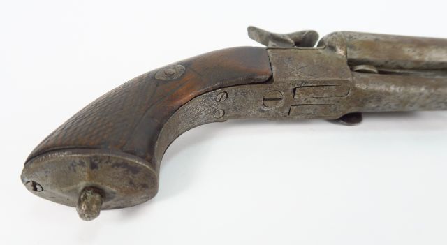Pistolet double de défense mi XIX eme, à coffre et à percussion, deux canons juxtaposés rond, mécanismes fonctionnels, pontet, monture à calotte bois proéminente. On y joint un pistolet double espagnol basculant en calibre 12 mm à broche avec sureté à glissant sur les canons, monture avec accident et maques, mécanismes à revoir. Armes de catégorie « D » (1)
