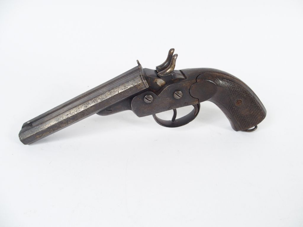 Pistolet double système Remington Rolling-Block calibre 450 ou 12mm Percussion centrale. Arme montée sur carcasse fer vierge de tous marquages ou poinçons, deux canons en table octogonaux à âme lisse (sale). Deux plaquettes de crosse en noyer vernis et quadrillé, anneau de calotte. Arme de défense de la fin du XIXème siècle de fabrication probablement espagnole (Eibar). Mécanisme fonctionnel. 1-. D