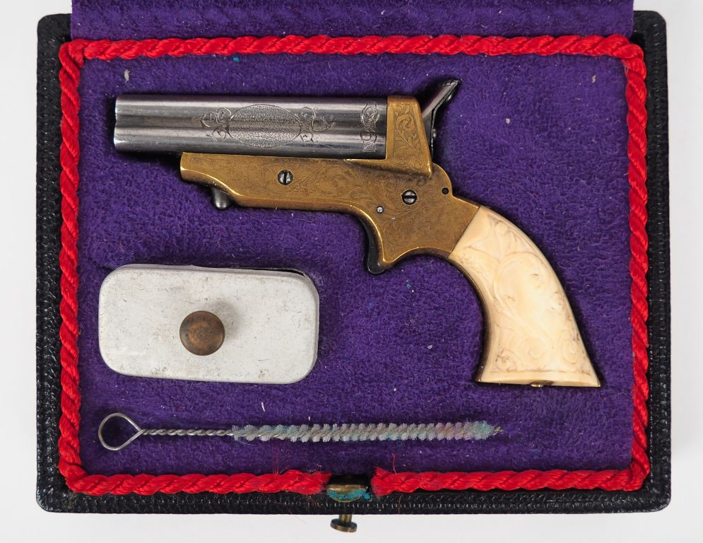Pistolet Sharps miniature, quatre coups. Bloc de quatre canons gravés. Bascule en laiton gravé. Détente éperon. Plaquettes de crosse façon ivoire ciselé de rinceaux feuillagé. Dans son écrin gainé de suédine mauve, en forme. Longueur arme : 7 cm. Coffret : 9 x 7 cm. B.E. Mécanique fonctionnelle.